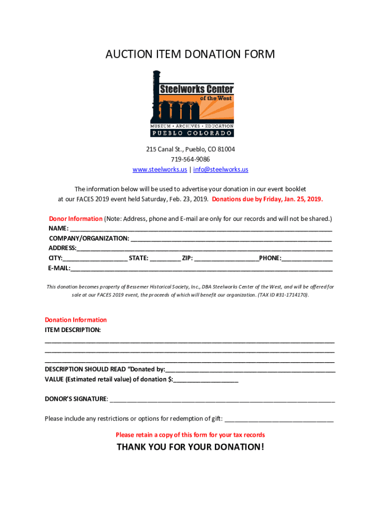 AUCTION ITEM DONATION FORM215 Canal St., Pueblo, CO 81004 7195649086 www.steelworks.us info steelworks.us The information below will be used to advertise your donation in our event booklet at our