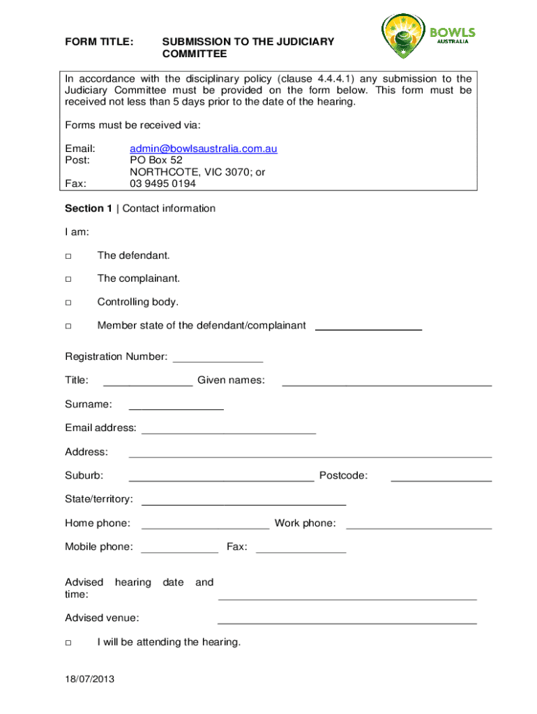 FORM TITLE:SUBMISSION TO THE JUDICIARY COMMITTEE In accordance with the disciplinary policy (clause 4.4.4.1) any submission to the Judiciary Committee must be provided on the form below. This form
