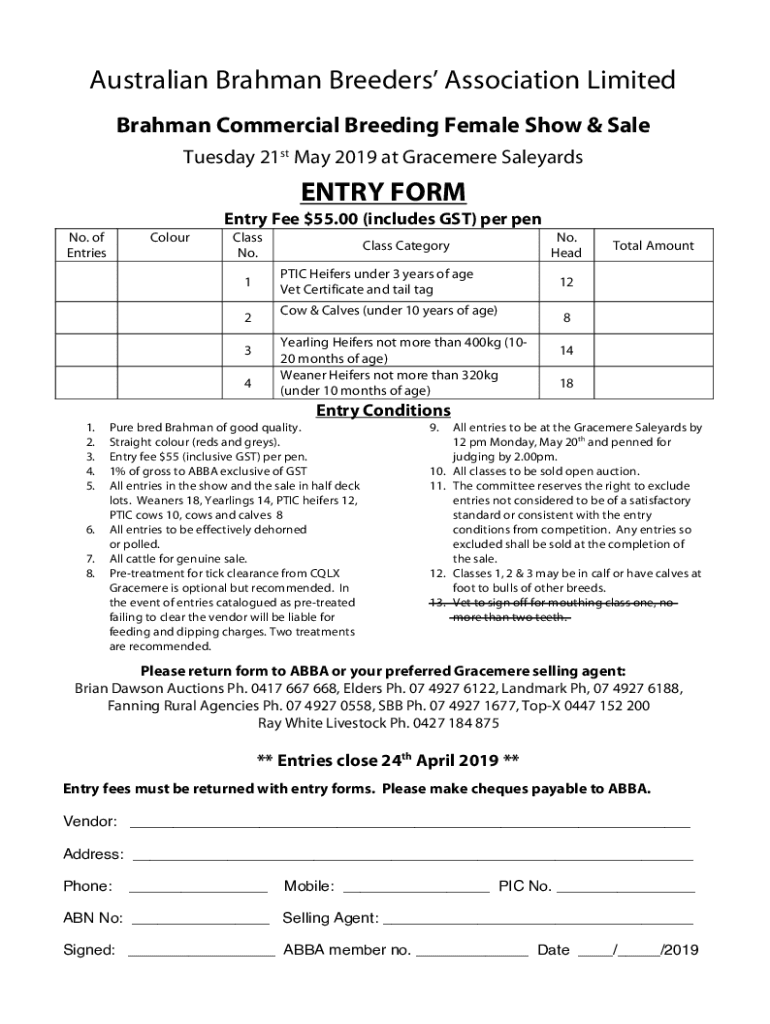 Australian Brahman Breeders Association Limited Brahman Commercial Breeding Female Show & Sale Tuesday 21st May 2019 at Grace mere SaleyardsENTRY Forestry Fee $55.00 (includes GST) per pen No. of
