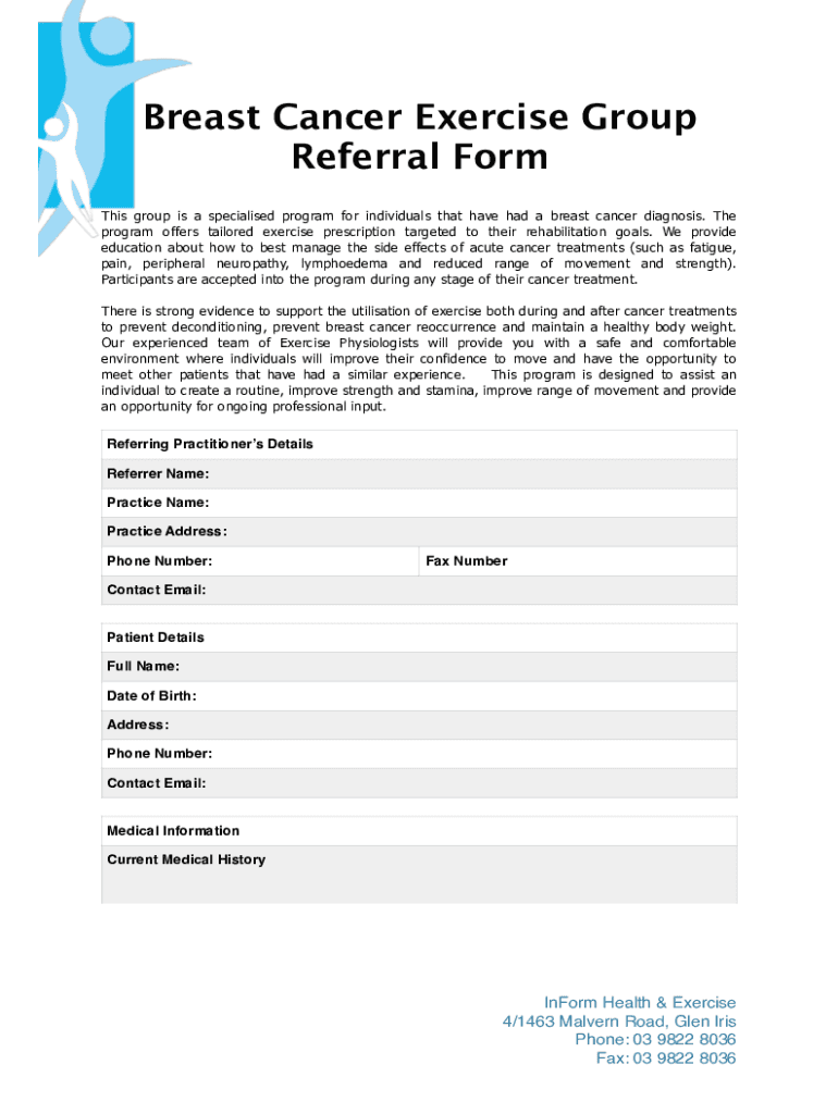 Get the free Breast Cancer Group Exercise Referral Form - InForm Exercise