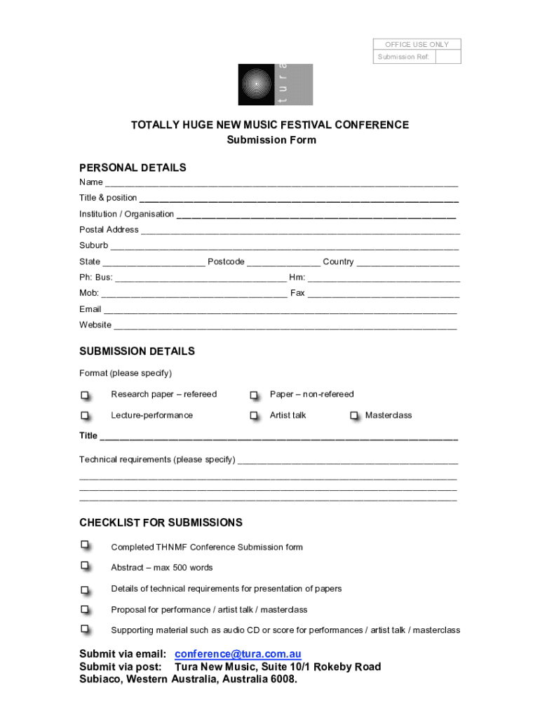 OFFICE USE ONLY Submission Ref:TOTALLY HUGE NEW MUSIC FESTIVAL CONFERENCE Submission Form PERSONAL DETAILS Name Title & position Institution / Organization Postal Address Suburb State Postcode Country