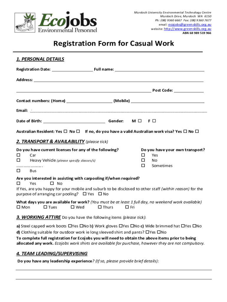 Get the free ABN 68 989 519 966 Registration Form for Casual Work - greenskills org