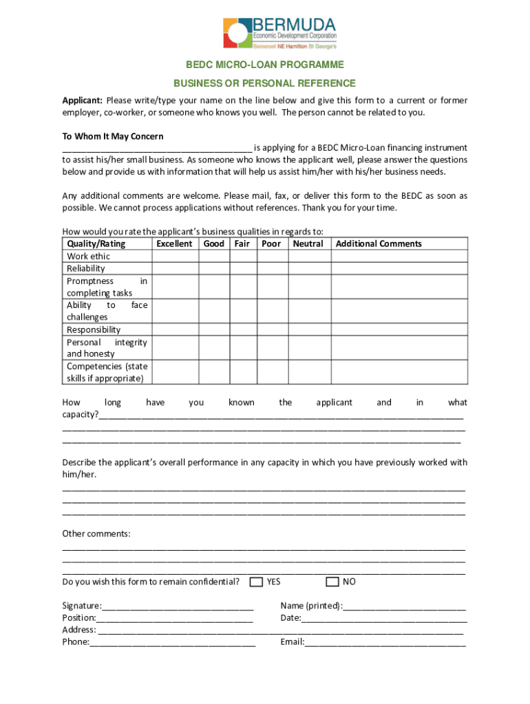 BED MICROLOAN Program BUSINESS OR PERSONAL REFERENCE Applicant: Please write/type your name on the line below and give this form to a current or former employer, coworker, or someone who knows you