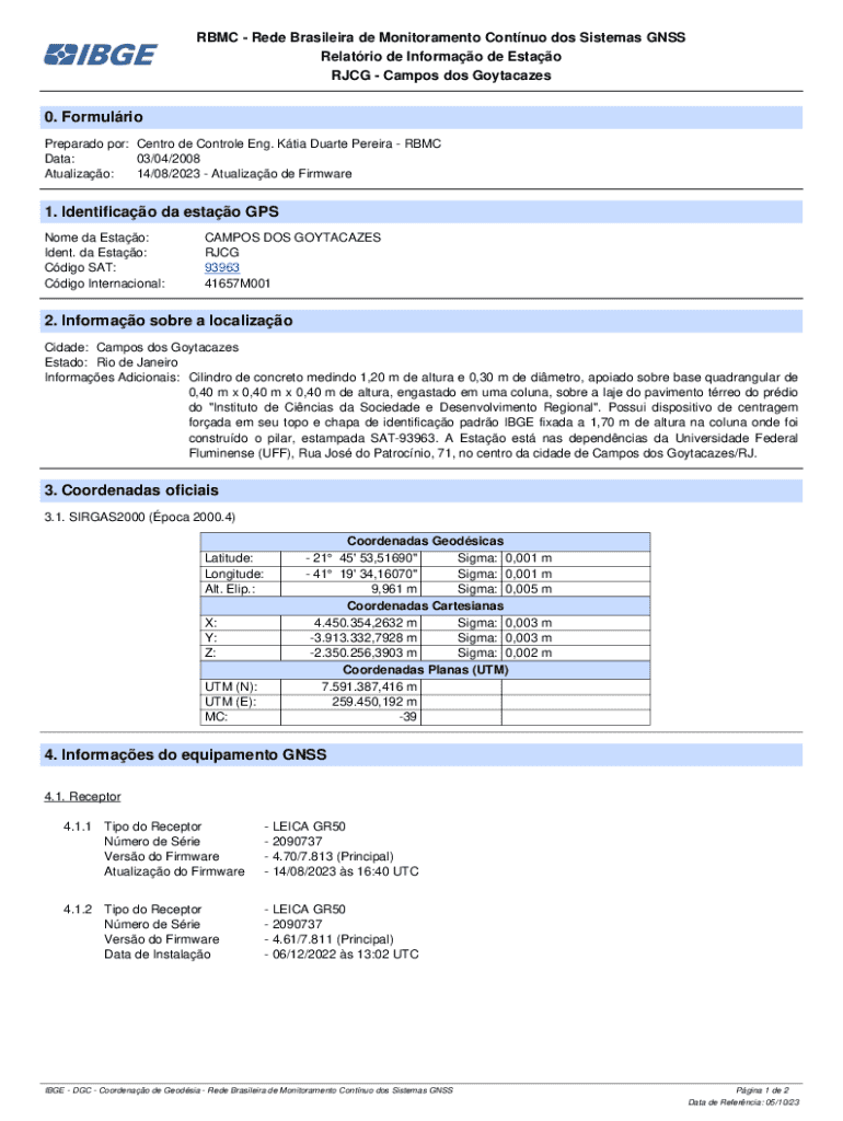 Relatório informativo sobre a estação GPS RJCG localizada em Campos dos Goytacazes, incluindo detalhes sobre a posição geográfica, equipamento GNSS utilizado, características da antena e informações