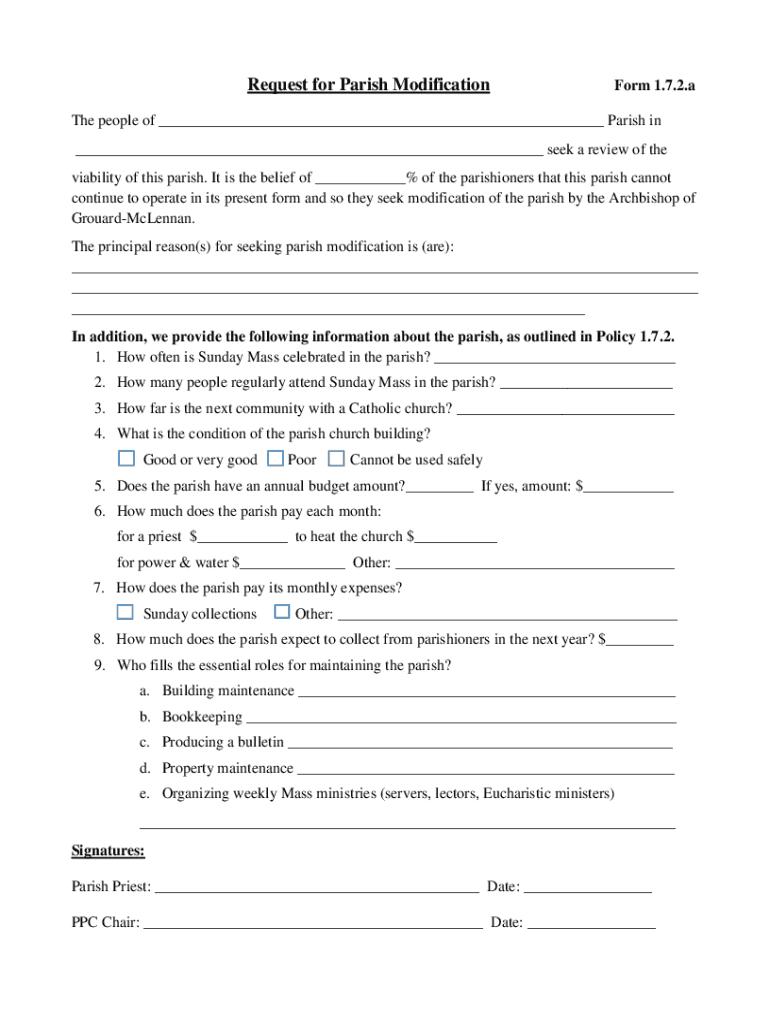 Request for Parish ModificationForm 1.7.2.the people of Parish in seek a review of the viability of this parish. It is the belief of % of the parishioners that this parish cannot continue to operate