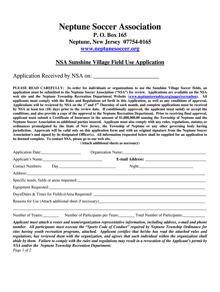 Neptune Soccer Association P. O. Box 165 Neptune, New Jersey 07754-0165 www.neptunesoccer.org NSA Sunshine Village Field Use Application Received by NSA on: PLEASE READ CAREFULLY: In order for individuals