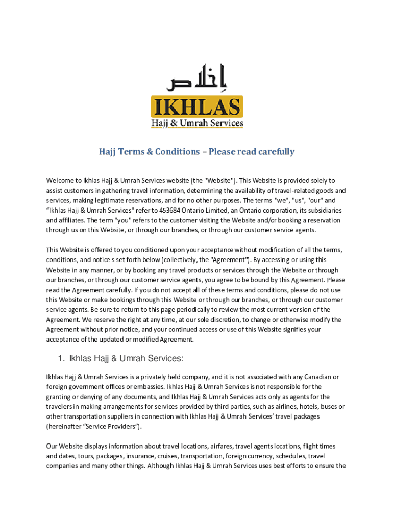 Hajj Terms & Conditions Please read carefully Welcome to Kolas Hajj & Umrah Services website (the “Website “). This Website is provided solely to assist customers in gathering travel information,