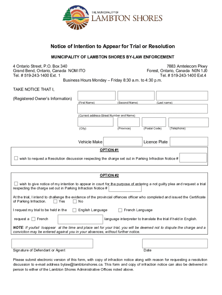 Get the free Notice of Intention to Appear for Trial or ... - Lambton Shores