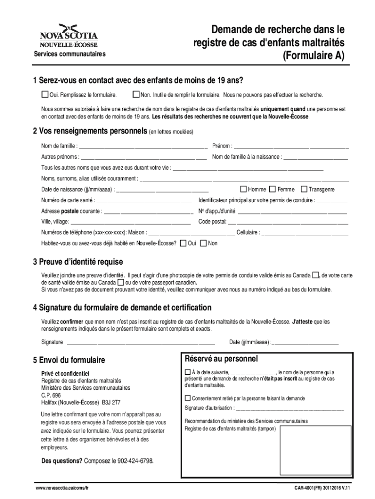 Demand DE recherché days LE register de CAS d 'infants maltreats (Formula ire A)Services communautaires1 Various en contact Alec DES infants DE coins DE 19 ans? OUI. Remplissez LE formula ire. Non.