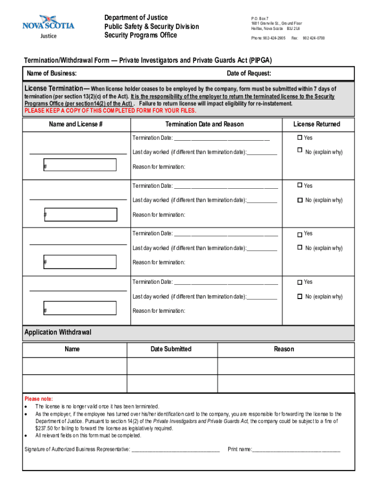 Department of Justice Public Safety & Security Division Security Programs Office. O. Box 7 1681 Granville St., First Floor Halifax, Nova Scotia B3J 2L6 Phone: 9024242905Fax:902 4240700Termination/Withdrawal