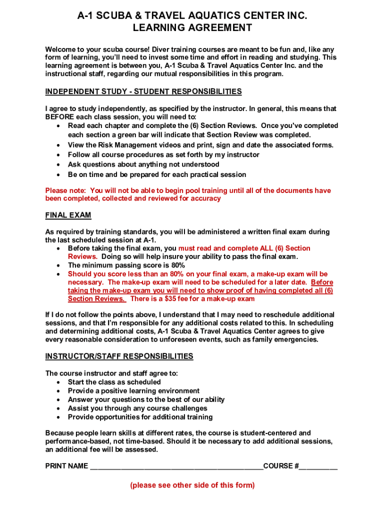 A1 SCUBA & TRAVEL AQUATICS CENTER INC. LEARNING AGREEMENT Welcome to your scuba course! Diver training courses are meant to be fun and, like any form of learning, you'll need to invest some time and