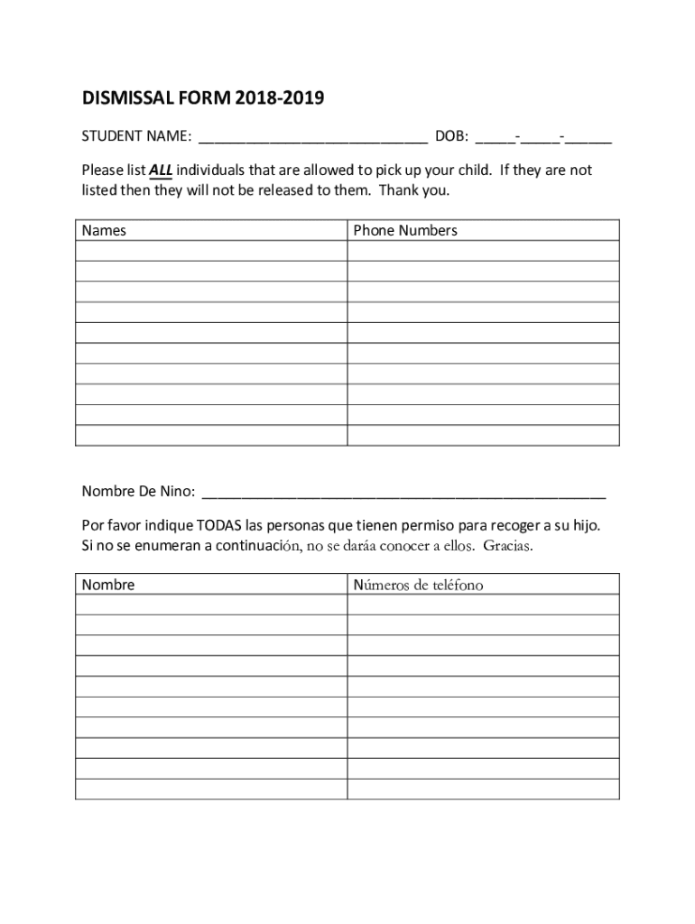 DISMISSAL FORM 20182019 STUDENT NAME: DOB: Please list ALL individuals that are allowed to pick up your child. If they are not listed then they will not be released to them. Thank you. Namespace NumbersNombre