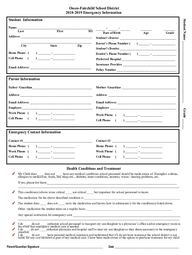 OsseoFairchild School District 20182019 Emergency Informational: Last First MI / / Address: Students Doctor City State Update of Birth Doctors Phone Number (Degrade) Students Dentist Home Phone ()