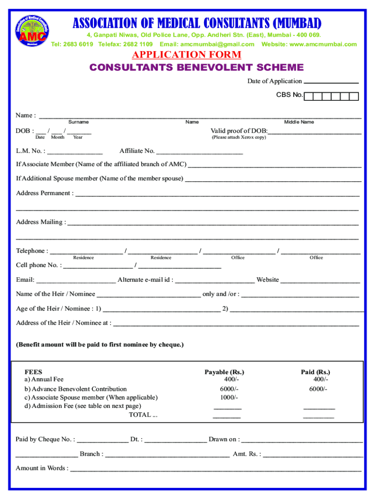 ASSOCIATION OF MEDICAL CONSULTANTS (MUMBAI) 4, Anti Ni was, Old Police Lane, Opp. Adhere STN. (East), Mumbai 400 069. Tel: 2683 6019 Telefaxes: 2682 1109Email: Mumbai Gmail.website: www.amcmumbai.comAPPLICATION