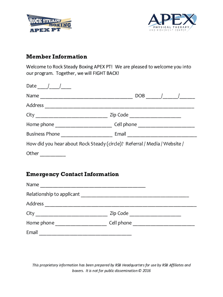 Member Information Welcome to Rock Steady Boxing APEX PT! We are pleased to welcome you into our program. Together, we will FIGHT BACK! Date / / Name DOB / / Address City Zip Code Home phone Cell