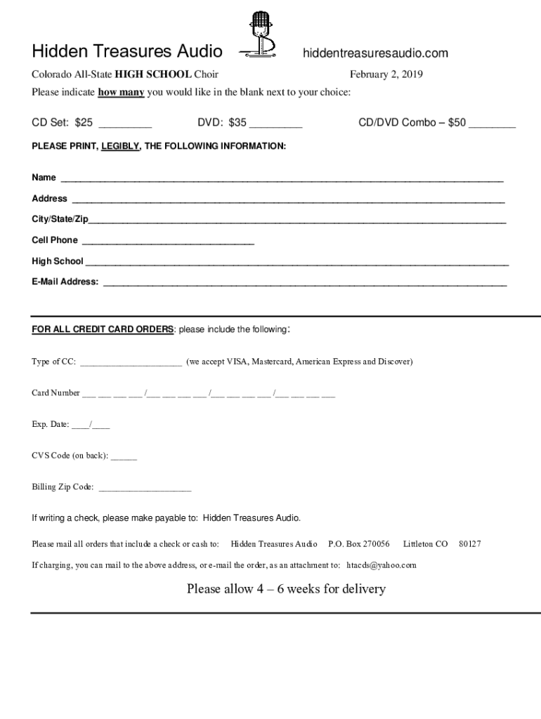 Hidden Treasures Audiohiddentreasuresaudio.com Colorado Allstate HIGH SCHOOL Choir February 2, 2019Please indicate how many you would like in the blank next to your choice: CD Set: $25 CD/DVD Combo