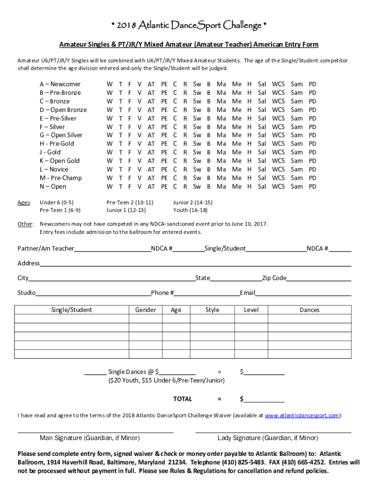 * 2018 Atlantic Dance Sport Challenge * Amateur Singles & PT/JR/Y Mixed Amateur (Amateur Teacher) American Entry Form Amateur U6/PT/JR/Y Singles will be combined with U6/PT/JR/Y Mixed Amateur Students.