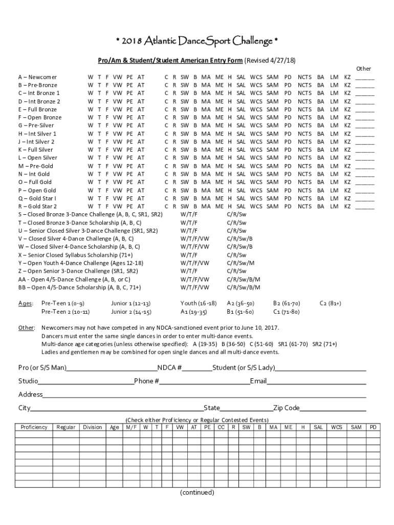 * 2018 Atlantic Dance Sport Challenge * Pro/Am & Student/Student American Entry Form (Revised 4/27/18) A Newcomer W T F VW PE AT B Bronze W T F VW PE AT C Int Bronze 1 W T F VW PE AT D Int Bronze