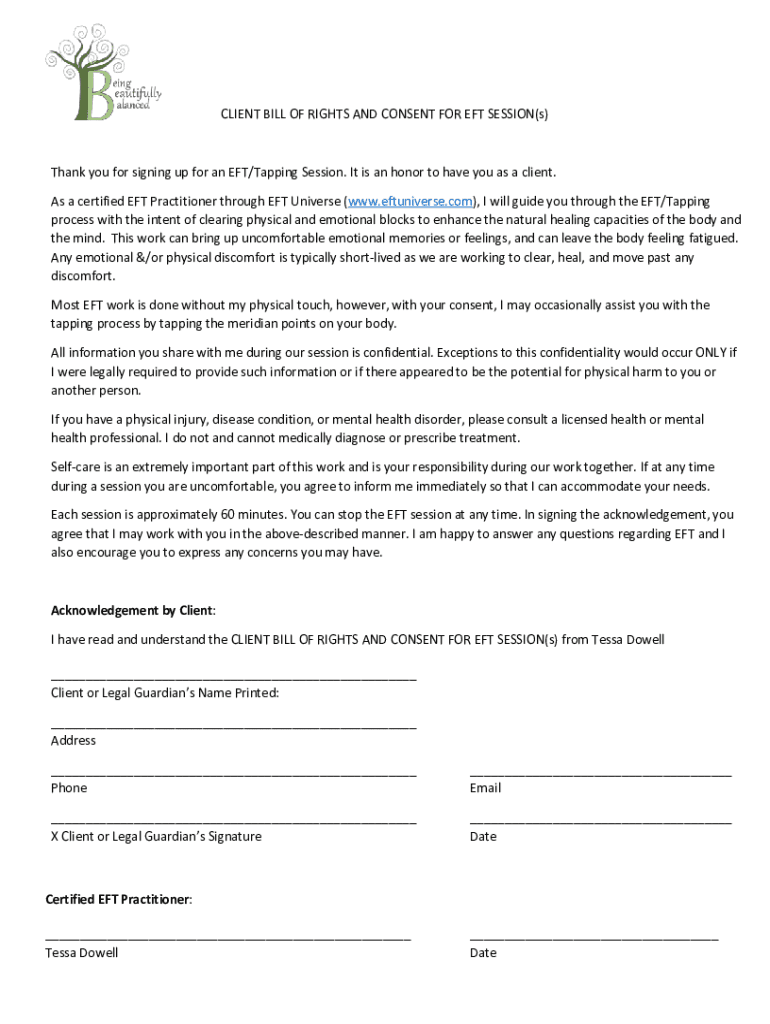 CLIENT BILL OF RIGHTS AND CONSENT FOR EFT SESSION(s)Thank you for signing up for an EFT/Tapping Session. It is an honor to have you as a client.