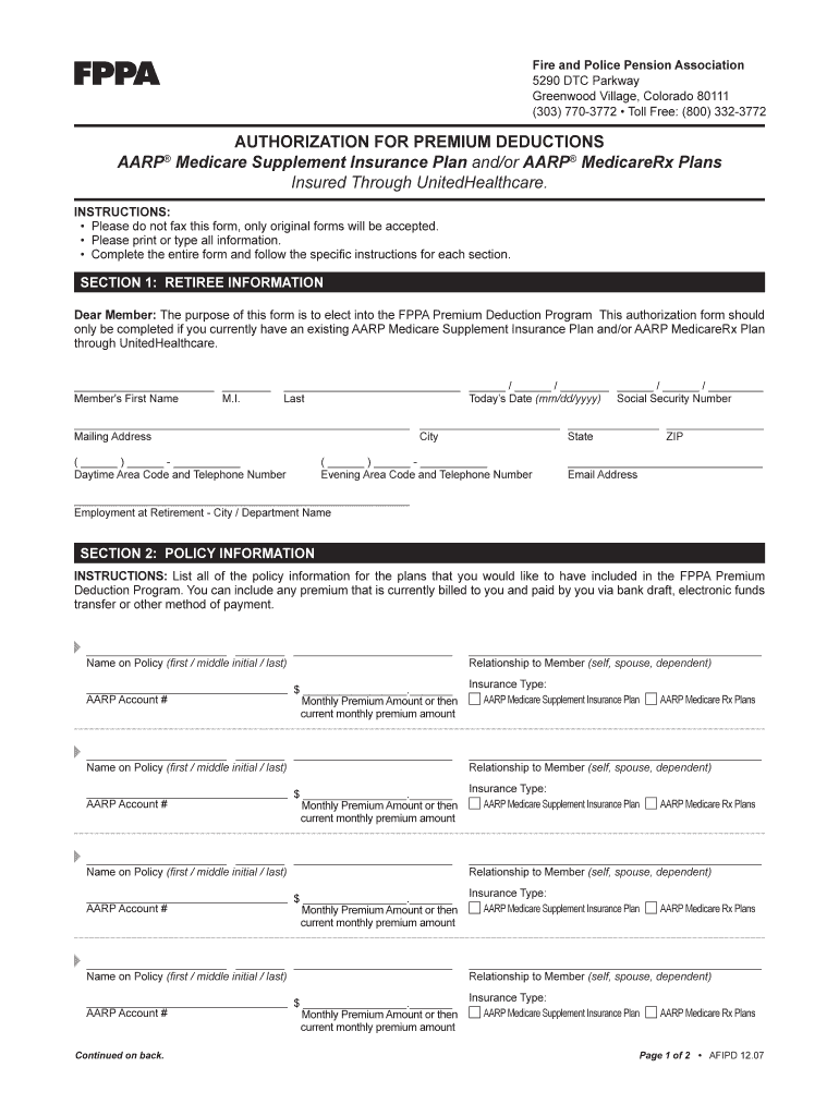 The Authorization for Premium Deductions form is specifically designed for retirees to authorize premium deductions from their pension payments. This form plays a critical role in facilitating enrollment into the FPPA Premium Deduction Program for options such as the AARP Medicare Supplement Insurance Plan and AARP MedicareRx Plans. By completing this form, retirees ensure that their premium payments are efficiently handled through direct deductions.
