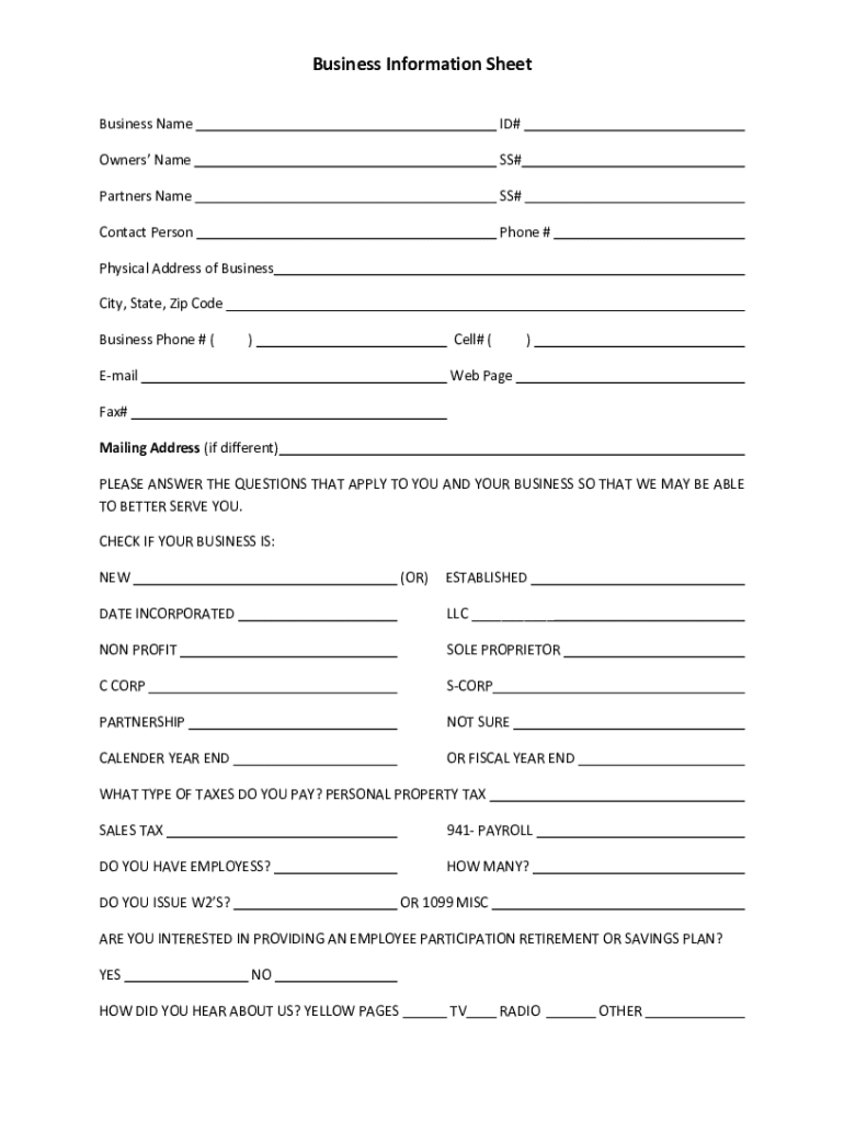 Business Information Sheet Business Named#Owners Names#Partners Names#Contact Persephone #Physical Address of Business City, State, Zip Code Business Phone # ()Cell# (Email)Web Page# Mailing Address