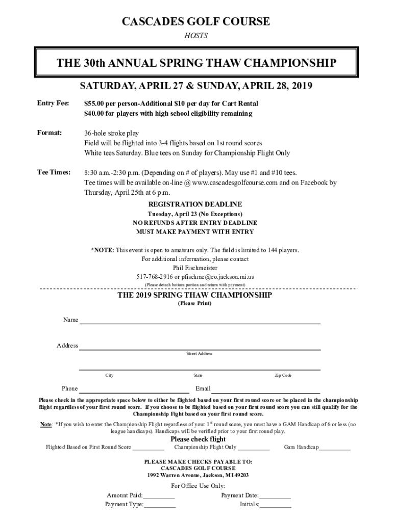 CASCADES GOLF COURSE HOSTS 30th ANNUAL SPRING THAW CHAMPIONSHIP SATURDAY, APRIL 27 & SUNDAY, APRIL 28, 2019, Entry Fee:$55.00 per personAdditional $10 per day for Cart Rental $40.00 for players with