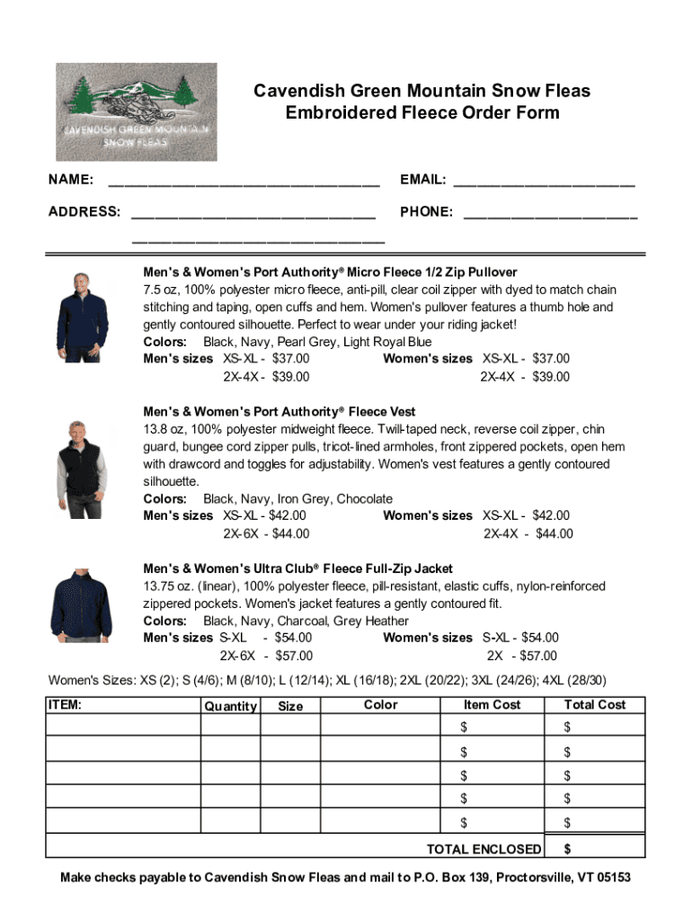 Cavendish Green Mountain Snow Fleas Embroidered Fleece Order Forename: ADDRESS: EMAIL: PHONE: Men's & Women's Port Authority Micro Fleece 1/2 Zip Pullover 7.5 oz, 100% polyester micro fleece, antipill,