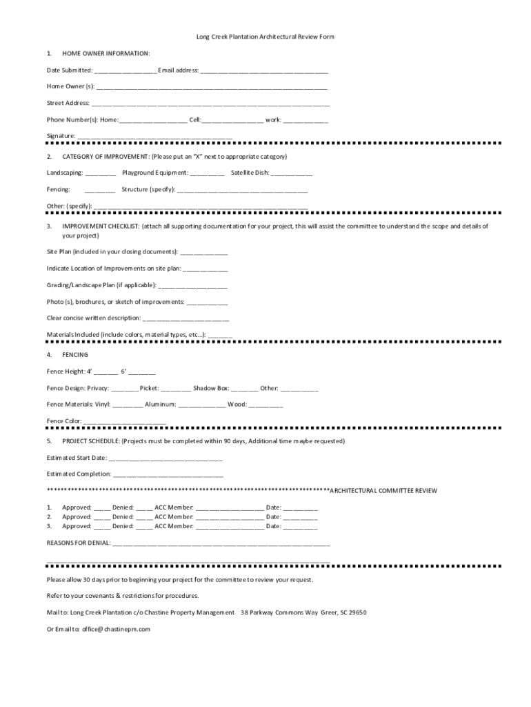 Get the free Long Creek Plantation Architectural Review Form 1. HOME OWNER ...