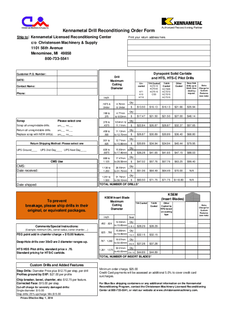 Kennametal Drill Reconditioning Order Form Ship to: Kennametal Licensed Reconditioning Enterprise your return address here.c/o Christensen Machinery & Supply 1101 56th Avenue Menominee, MI 49858 8007335541Dynapoint