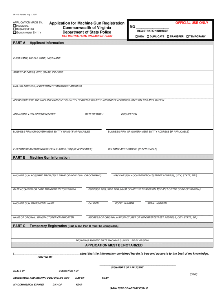 SP115 Revised May 1, 2007APPLICATION MADE BY:INDIVIDUAL BUSINESS FIRM GOVERNMENT ENTITYApplication for Machine Gun Registration Commonwealth of Virginia Department of State PoliceOFFICIAL USE ONLY