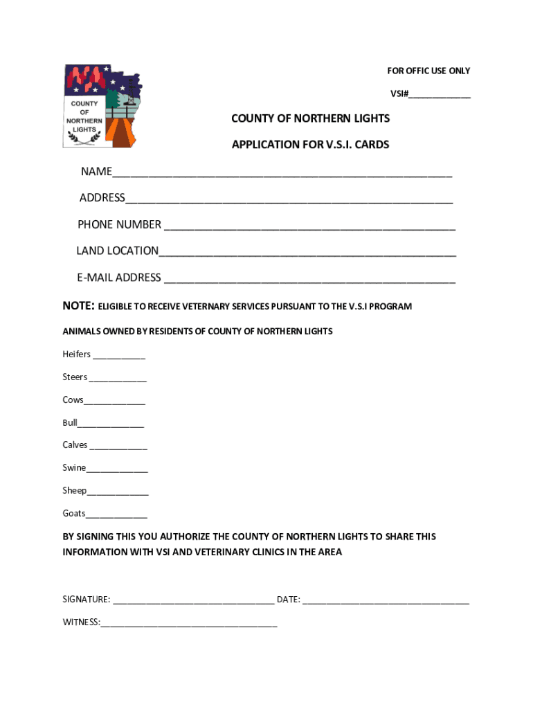 FOR OFFICE USE ONLY VS# COUNTY OF NORTHERN LIGHTS APPLICATION FOR V.S.I. CARDS NAME ADDRESS PHONE NUMBER LAND LOCATION EMAIL ADDRESS NOTE: ELIGIBLE TO RECEIVE VETERINARY SERVICES PURSUANT TO THE V.S.I