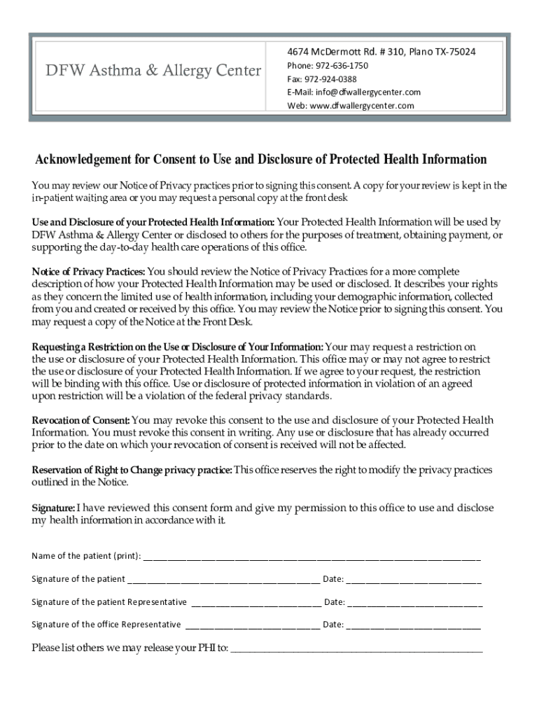 4674 McDermott Rd. # 310, Plano TX75024DFW Asthma & Allergy Interphone: 9726361750Fax: 9729240388EMail: info dfwallergycenter.cobweb: www.dfwallergycenter.comAcknowledgement for Consent to Use and