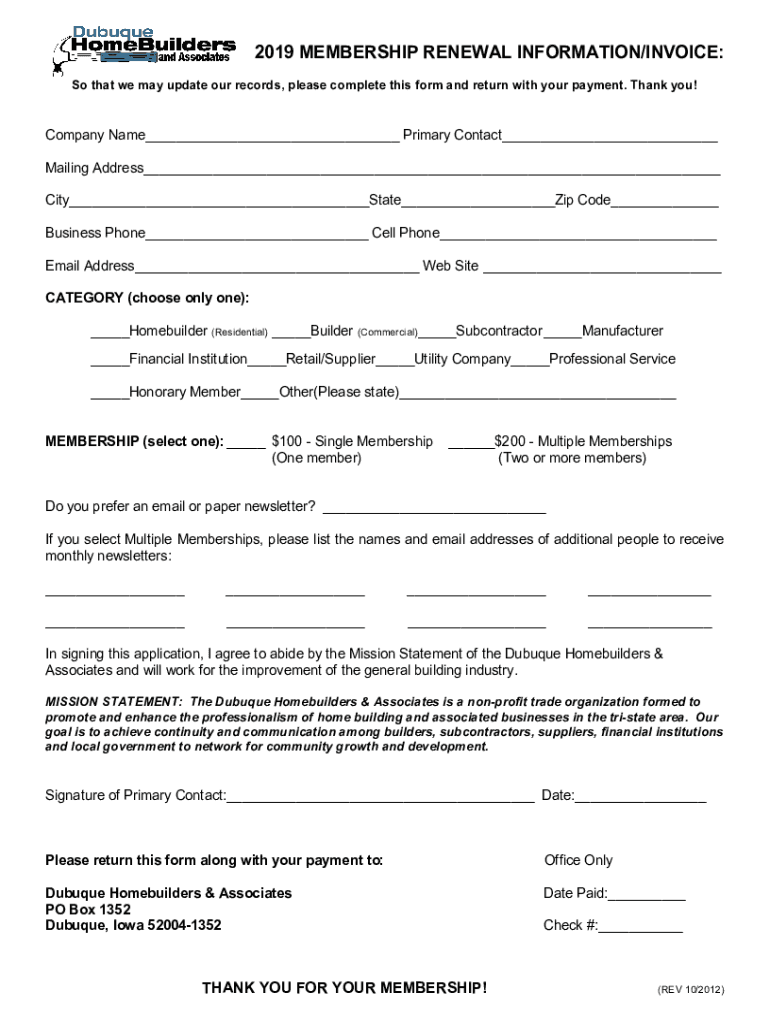 2019 MEMBERSHIP RENEWAL INFORMATION/INVOICE: So that we may update our records, please complete this form and return with your payment. Thank you! Company Name Primary Contact Mailing Address City