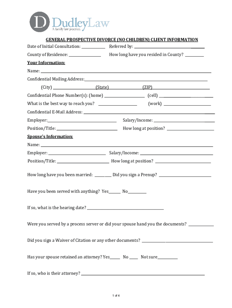 GENERAL PROSPECTIVE DIVORCE (NO CHILDREN) CLIENT INFORMATION Date of Initial Consultation: Referred by: County of Residence: How long have you resided in County? Your Information: Name: Confidential