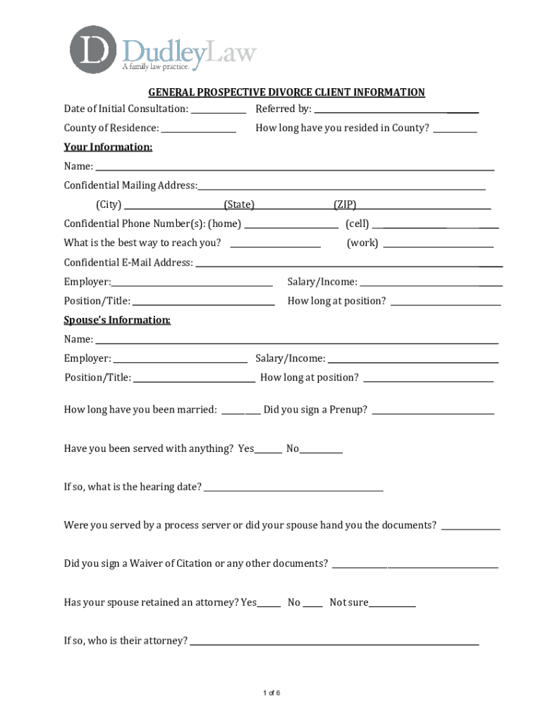 GENERAL PROSPECTIVE DIVORCE CLIENT INFORMATION Date of Initial Consultation: Referred by: County of Residence: How long have you resided in County? Your Information: Name: Confidential Mailing Address: