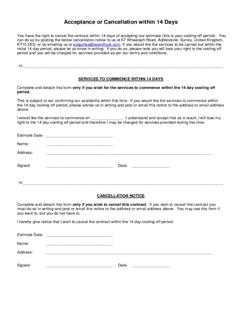 You have the right to cancel the contract within 14 days of accepting our estimate (this is your cooling-off period). You