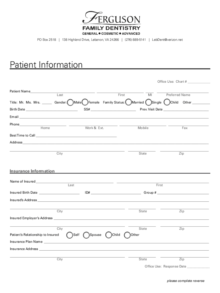 PO Box 2518 138 Highland Drive, Lebanon, VA 24266 (276) 8895141 Leiden Verizon. Outpatient Information Office Use: Chart # Patient Name LastFirstMIPreferred Name Title: Mr. Ms. Mrs. Gender:Rebirth