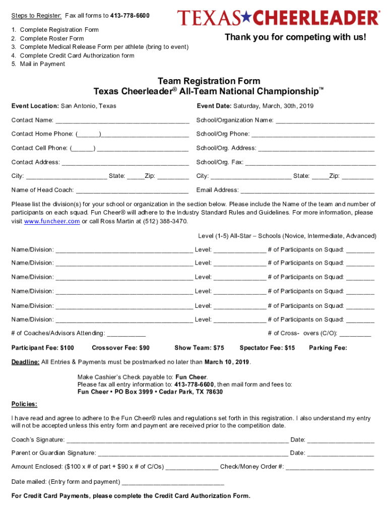 Steps to Register: Fax all forms to 4137786600 1. 2. 3. 4. 5. Complete Registration Form Complete Roster Form Complete Medical Release Form per athlete (bring to event) Complete Credit Card Authorization