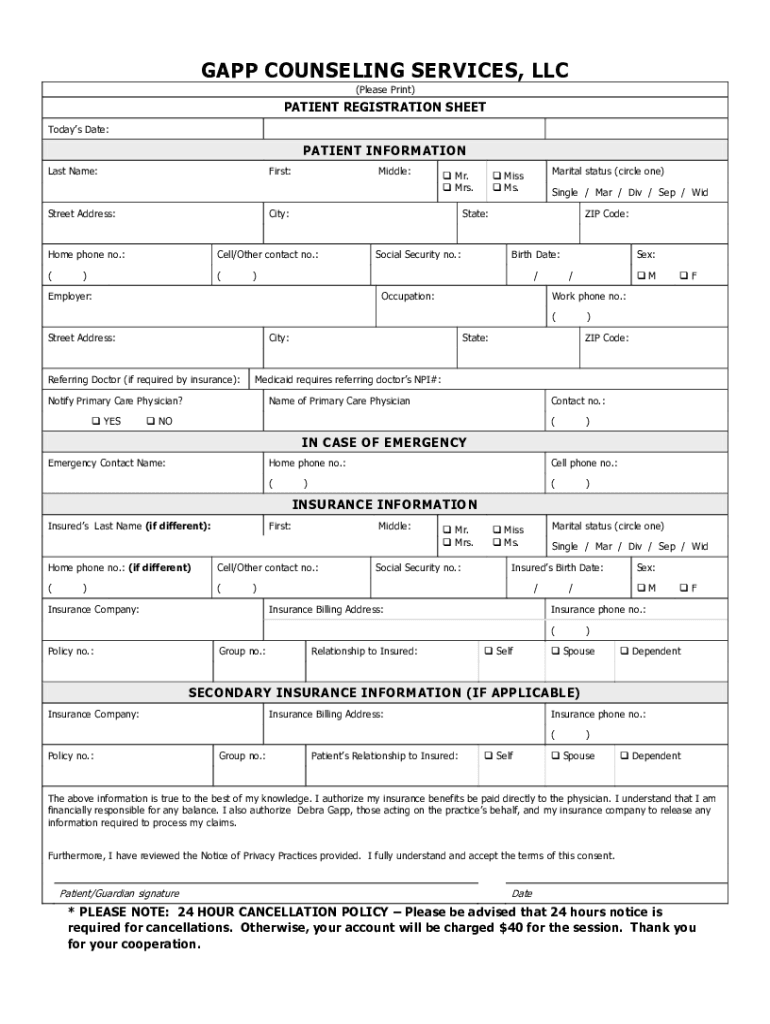 GAP COUNSELING SERVICES, LLC (Please Print)PATIENT REGISTRATION SHEET Today's Date:PATIENT INFORMATION Last Name:First:Street Address:Middle: Mr. Mrs. City:Single / Mar / Div / Sep / Instate:Home