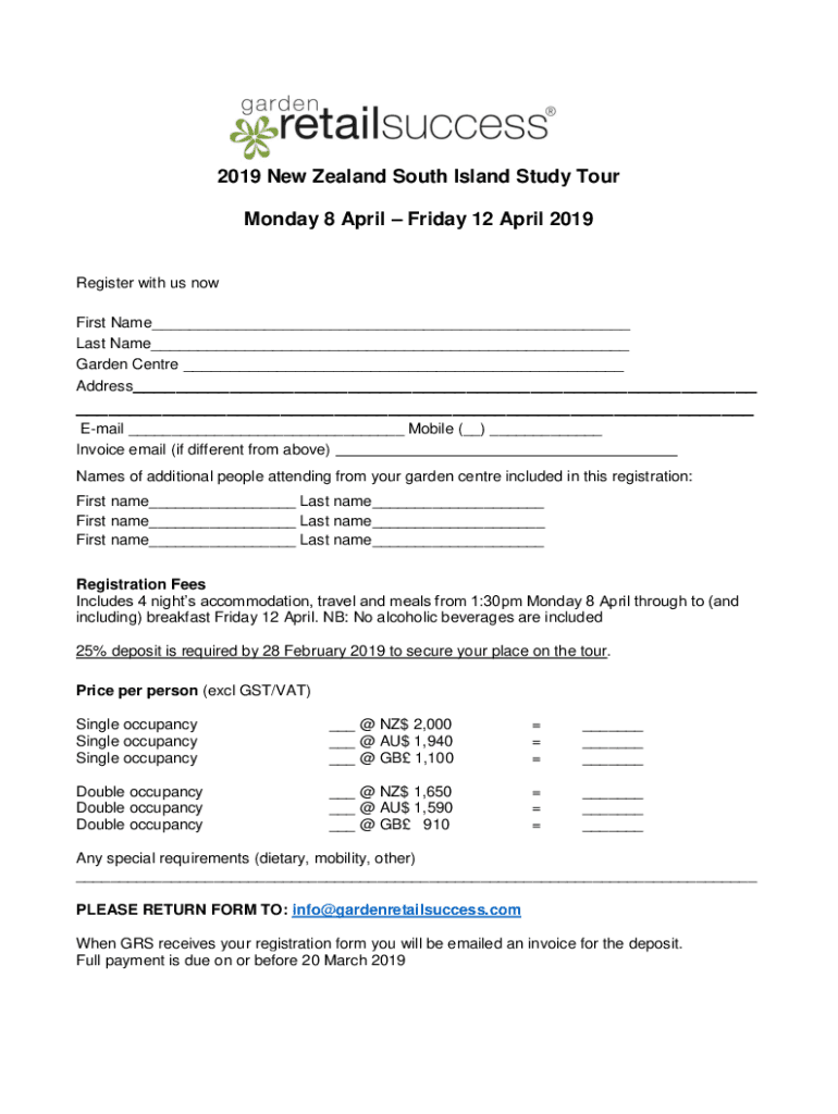 2019 New Zealand South Island Study Tour Monday 8 April Friday 12 April 2019Register with us now First Name Last Name Garden Center Address Email Mobile () Invoice email (if different from above)