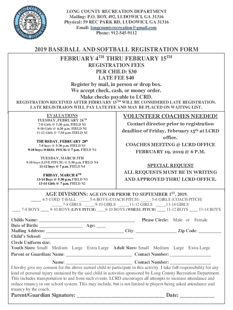 Get the free 2019 BASEBALL AND SOFTBALL REGISTRATION FORM FEBRUARY 4TH ...