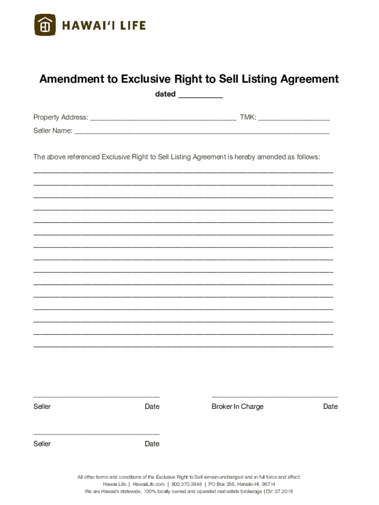 Amendment to Exclusive Right to Sell Listing Agreement dated Property Address: MK: Seller Name: The above referenced Exclusive Right to Sell Listing Agreement is hereby amended as follows: SellerBroker