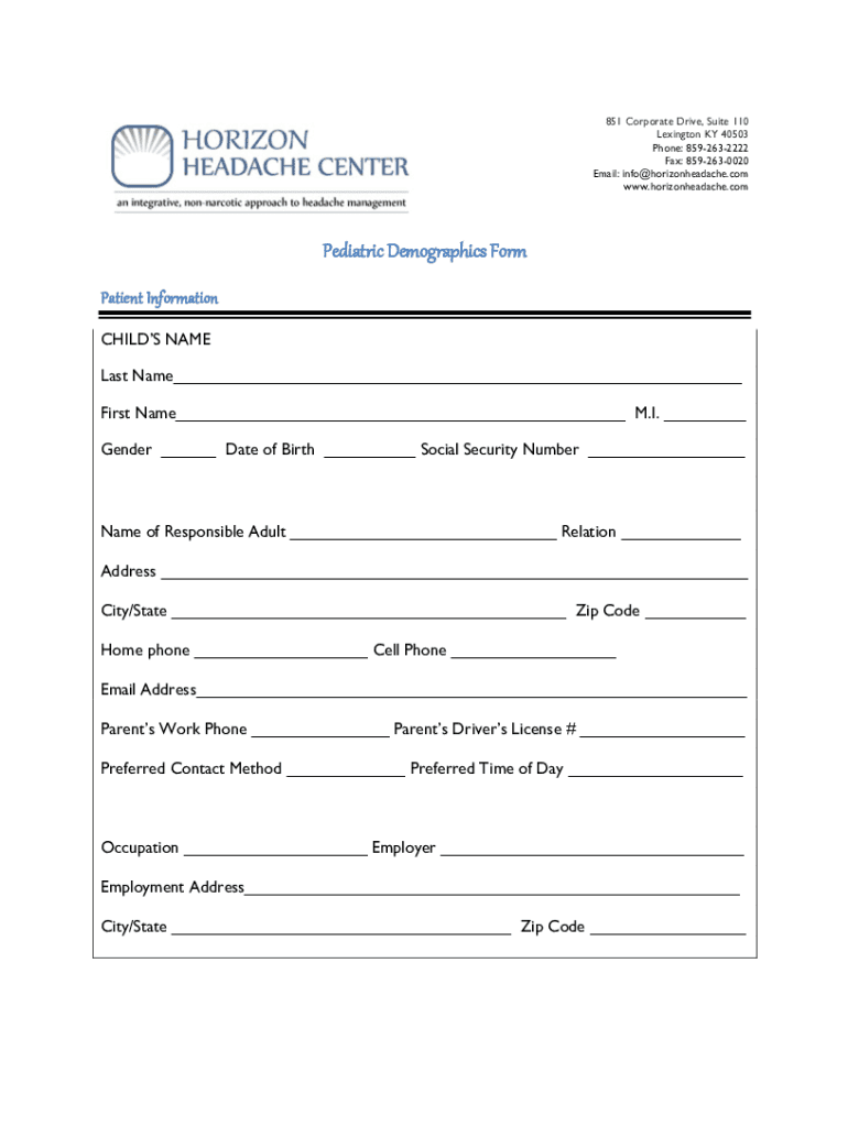 851 Corporate Drive, Suite 110 Lexington KY 40503 Phone: 8592632222 Fax: 8592630020 Email: info horizonheadache.com www.horizonheadache.comPediatric Demographics Form Patient Information CHILD NAME