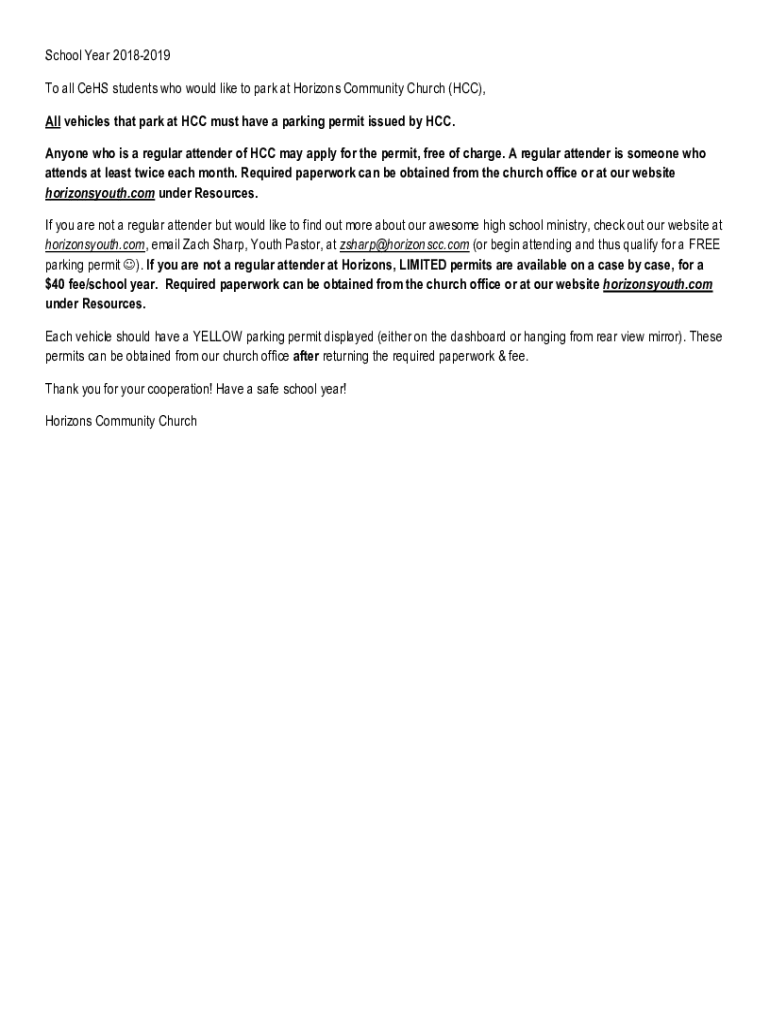 To all CEPS students who would like to park at Horizons Community Church (HCC),