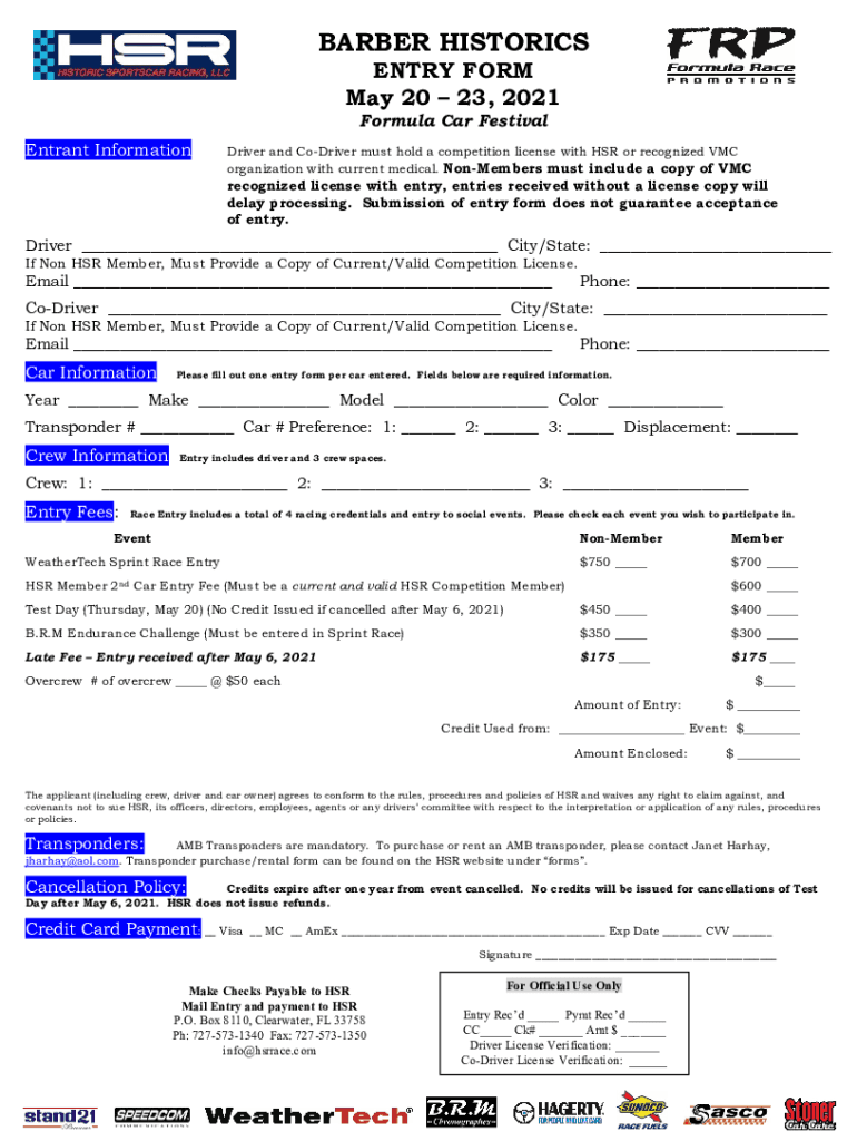 BARBER HISTORIC SENTRY FORM May 20 23, 2021 Formula Car FestivalEntrant InformationDriver and Cod river must hold a competition license with HER or recognized VMC organization with current medical.