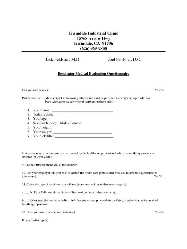 Irwin dale Industrial Clinic 15768 Arrow Hwy Irwin dale, CA 91706 (626) 9699800 Jack Feldspar, M.D. Joel Feldspar, D.O. Respirator Medical Evaluation Questionnaire Can you read (circle):Yes/Part A.