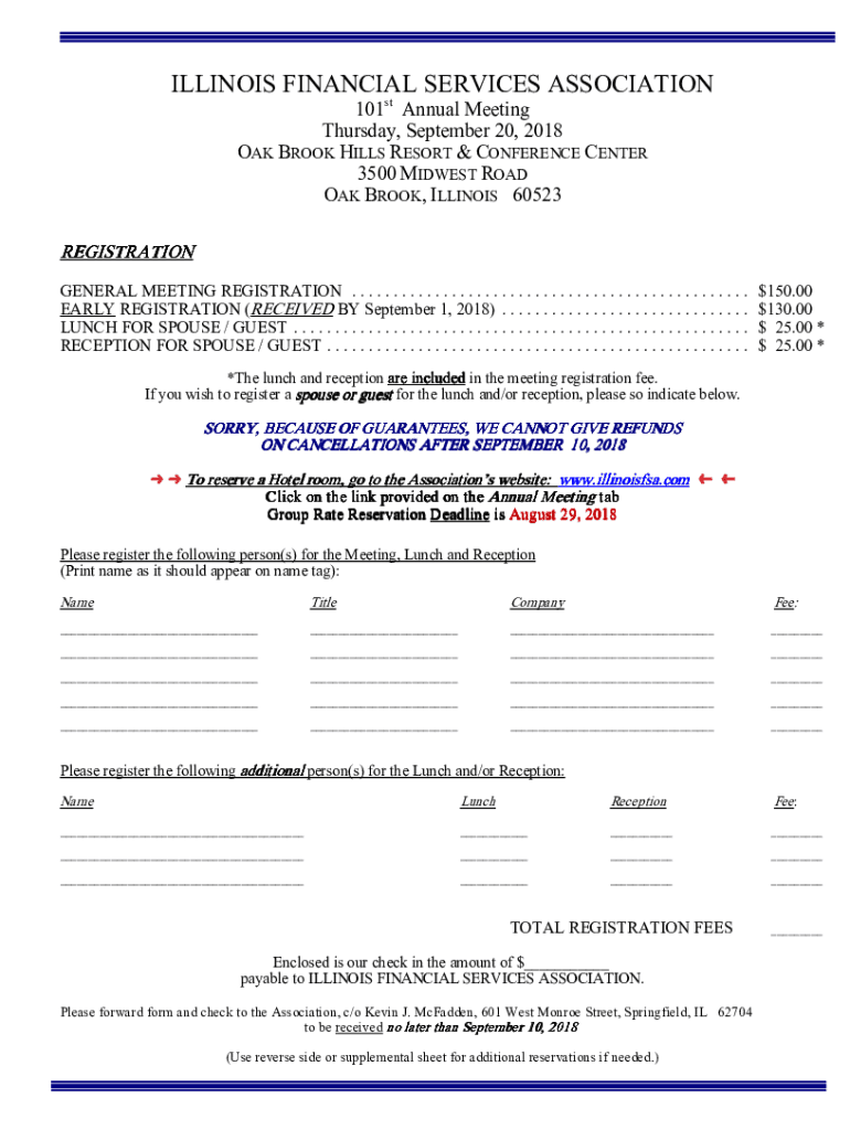 ILLINOIS FINANCIAL SERVICES ASSOCIATION 101st Annual Meeting Thursday, September 20, 2018, OAK BROOK HILLS RESORT & CONFERENCE CENTER 3500 MIDWEST ROAD OAK BROOK, ILLINOIS 60523REGISTRATION GENERAL