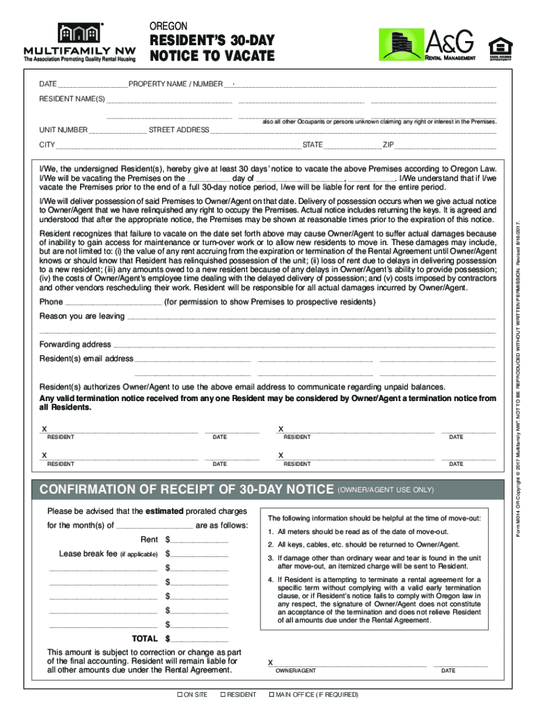OREGONA&GRESIDENTS 30DAY NOTICE TO VACATE AG CEMENT R ENT MENTAL AL M A N A. DATE PROPERTY NAME / NUMBER RESIDENT NAME(S) also all other Occupants or persons unknown claiming any right or interest