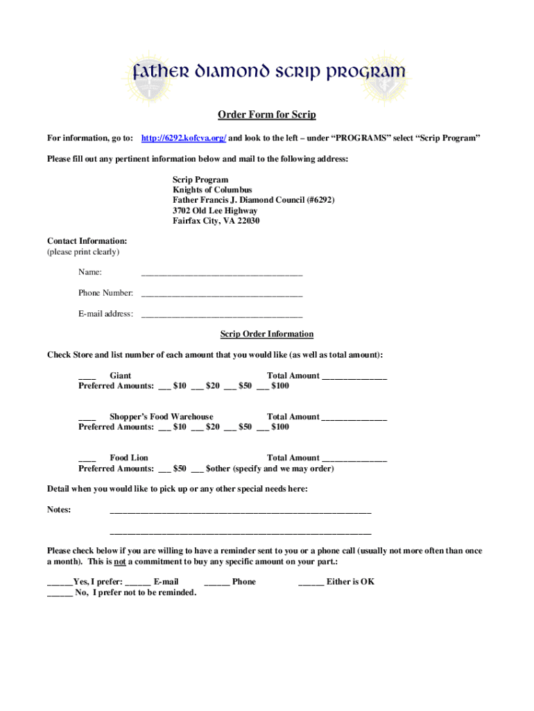 Order Form for Scrip For information, go to: http://6292.kofcva.org/ and look to the left under PROGRAMS select Scrip Program Please fill out any pertinent information below and mail to the following