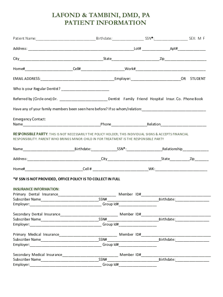 PLAFOND & TAMING, DMD, PA PATIENT INFORMATION Patient Name: Birthdate: SSN*: SEX: M F Address: Lot# Apt# City State Zip Home# Cell# Work# EMAIL ADDRESS: Employer: ORSTUDENTWho is your Regular Dentist?